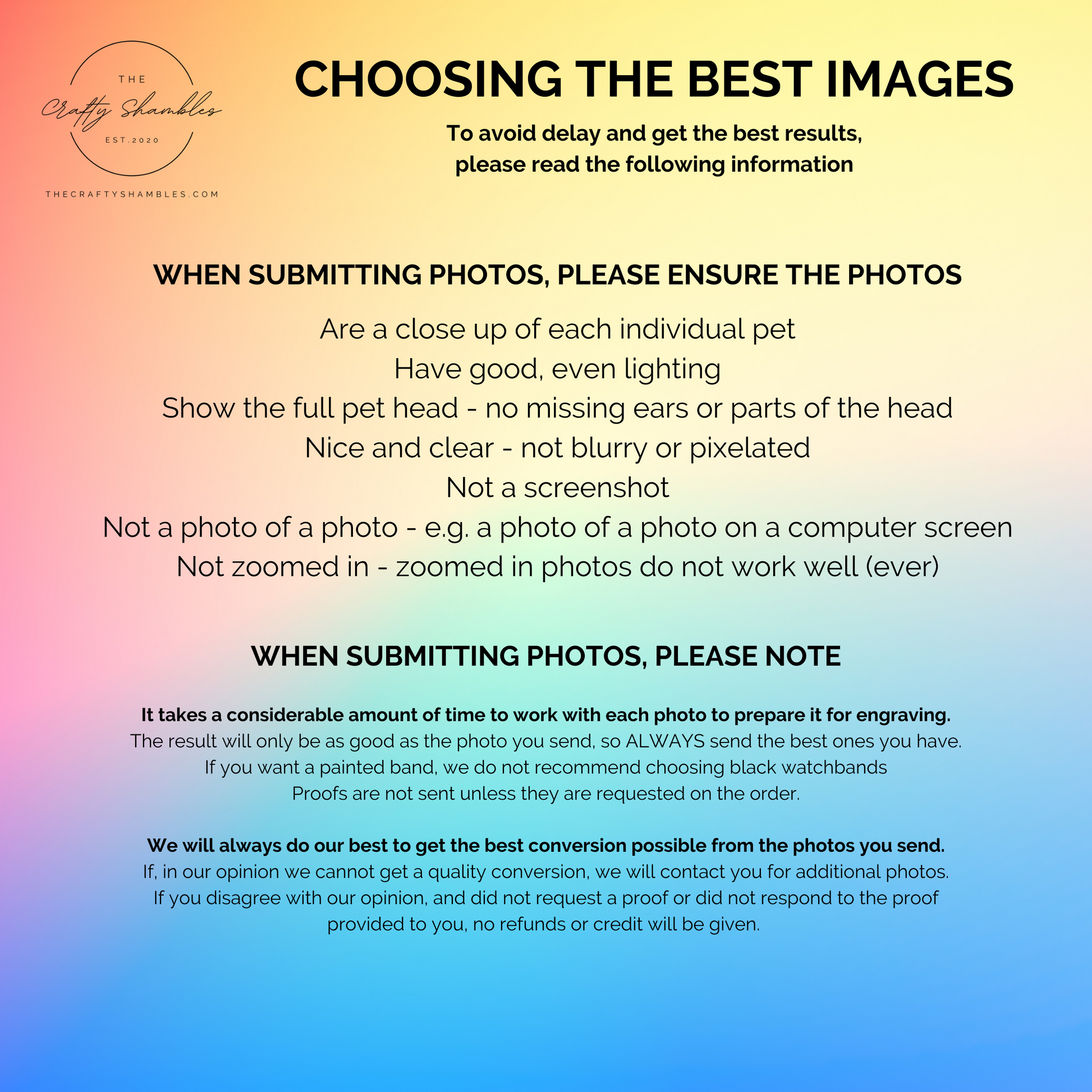 - Include the pet name/s even if you do not want their name engraved on the band. This helps us identify the dogs apart and request additional photos when necessary.